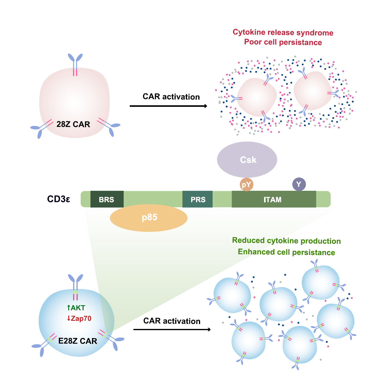 中國(guó)科學(xué)院上海生物化學(xué)與細(xì)胞生物學(xué)研究所許琛琦研究組、北京大學(xué)醫(yī)學(xué)部黃超蘭研究組和美國(guó)加州大學(xué)圣地亞哥分?;荻鞣蜓芯拷M合作,通過(guò)定量質(zhì)譜和生化方法發(fā)現(xiàn)TCR的CD3? 鏈具有特殊的信號(hào)轉(zhuǎn)導(dǎo)功能,可以同時(shí)招募抑制性分子Csk和活化性分子PI3K。將CD3? 胞內(nèi)區(qū)加入臨床使用的CAR序列中,可使得CAR-T細(xì)胞持續(xù)性更好,抗腫瘤功能更強(qiáng),并且細(xì)胞因子釋放綜合癥的風(fēng)險(xiǎn)降低。