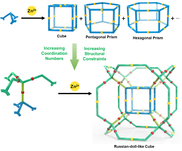 圖1. 三足配體配位組裝形成多面體混合物和雙層六足配體組裝形成雙層立方體示意圖。