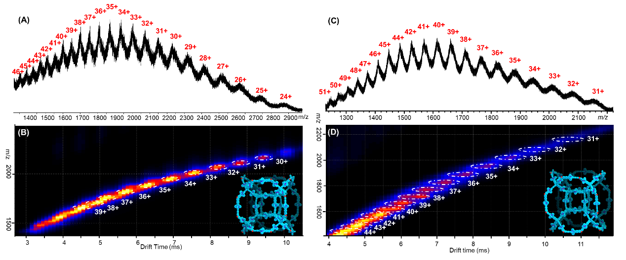 圖3. 配合物C1的(A)電噴霧質(zhì)譜(ESI-MS)和(B)二維行波離子移動(dòng)質(zhì)譜(2D ESI TWIM-M); 配合物C2的(C)電噴霧質(zhì)譜(ESI-MS)和(D)二維行波離子移動(dòng)質(zhì)譜(2D ESI TWIM-M)。