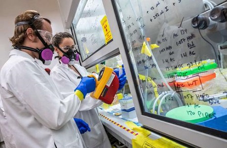 勞倫斯·伯克利國家實(shí)驗(yàn)室的化學(xué)家正在檢查锿-254的實(shí)驗(yàn)室樣品。