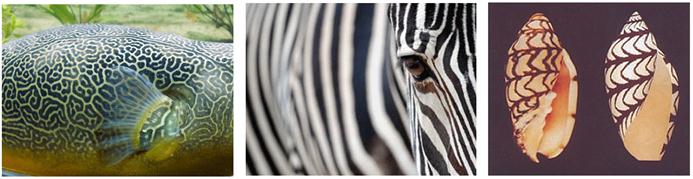 圖1.自然界中各種圖靈圖案:(a)河豚,(b)斑馬,(c)貝殼。