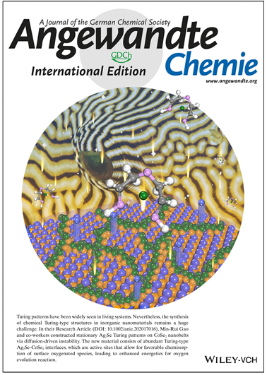近日,中國科學(xué)技術(shù)大學(xué)高敏銳教授研究組利用“反應(yīng)-擴散”的機制,首次實現(xiàn)了在無機過渡金屬硫族化合物上圖靈結(jié)構(gòu)的構(gòu)筑。在二乙烯三胺(DETA)與水的二元溶液中,Ag+會和DETA發(fā)生絡(luò)合反應(yīng)形成Ag(DETA)+,其擴散系數(shù)為3.518×10-6cm2s-1。同時,Co2+從二硒化鈷(CoSe2)納米帶表面溢出,其擴散系數(shù)為2.317×10-7cm2s-1。因此,在該系統(tǒng)中,Ag(DETA)+是抑制劑而Co2+是激活劑。快速擴散的Ag(DETA)+到達CoSe2表面的能斯特層(Nernst layer)時,與擴散到CoSe2表面的激活劑Co2+發(fā)生作用,最終在CoSe2表面形成復(fù)雜美麗的Ag2Se圖靈圖案(圖2)。相關(guān)研究成果以“An Efficient Turing-Type Ag2Se-CoSe2Multi-Interfacial Oxygen-Evolving Electrocatalyst”為題發(fā)表在《德國應(yīng)用化學(xué)》雜志上(Angew. Chem. Int. Ed.2021, 60,doi.org/10.1002/anie.202017016),并被選為Hot Paper和Back Cover(圖3)。論文的共同第一作者為中科大博士研究生張曉隆和楊朋朋。