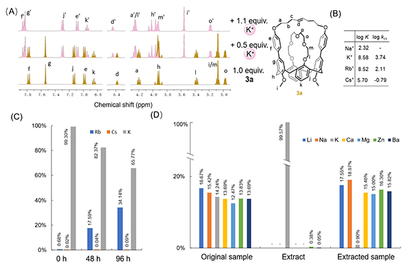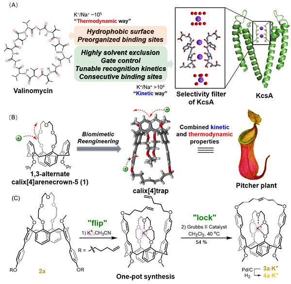 金屬離子在心跳、肌肉收縮及信號(hào)傳導(dǎo)等生理活動(dòng)具有至關(guān)重要的作用。在漫長(zhǎng)的進(jìn)化中,生命體發(fā)展出多樣的功能基元用來(lái)控制離子的選擇性識(shí)別和傳輸。例如,離子載體纈氨霉素 (Valinomycin) 通過(guò)6個(gè)羰基形成離子識(shí)別空腔,在熱力學(xué)上實(shí)現(xiàn)對(duì)K+/Na+的有效區(qū)分;鉀離子通道則利用具有連續(xù)的絡(luò)合位點(diǎn)受限孔道,控制不同離子的傳輸速率。仿生設(shè)計(jì)的超分子體系常常僅模擬單一的仿生結(jié)構(gòu)或者識(shí)別機(jī)制,將不同的識(shí)別機(jī)制整合在同一個(gè)超分子受體中,即可能實(shí)現(xiàn)多樣的功能及更高的選擇性。在本研究中,研究人員利用“翻轉(zhuǎn)-鎖定”的策略將冠醚結(jié)構(gòu)包裹在受限空間內(nèi)部。這種設(shè)計(jì)在可以保持原有離子絡(luò)合環(huán)境的情況下,改變離子絡(luò)合的路徑,迫使離子通過(guò)狹長(zhǎng)的絡(luò)合孔道進(jìn)入受體內(nèi)部 (圖一),將經(jīng)典的冠醚轉(zhuǎn)變成具有連續(xù)離子絡(luò)合位點(diǎn)的離子阱。研究表明,杯芳烴離子阱具有極高的鉀鈉選擇性,離子進(jìn)入受限孔道需要完全脫除溶劑,這一特性使水合鈉離子的絡(luò)合變得更為不利,而鉀離子絡(luò)合所受影響較小,進(jìn)一步促進(jìn)鉀鈉離子的高選擇性識(shí)別。大小不同的一價(jià)金屬離子與杯芳烴離子阱的絡(luò)合速率會(huì)隨著離子半徑的增大而顯著變慢,因此對(duì)于絡(luò)合強(qiáng)度相似的離子 (e.g. K+ and Rb+),可以利用絡(luò)合速度的差異在非平衡態(tài)實(shí)現(xiàn)離子的高效分離 (圖二C)。