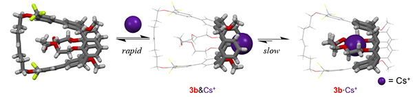 機(jī)理研究表明,離子與杯芳烴離子阱的絡(luò)合是一個(gè)分步過(guò)程,即杯芳烴入口起著“守門員”的作用,先對(duì)離子進(jìn)行快速預(yù)識(shí)別,之后再將離子較緩慢地“吞”入內(nèi)部的絡(luò)合空腔 (圖三)。這種獨(dú)特識(shí)別機(jī)制有可能用于設(shè)計(jì)智能分子識(shí)別系統(tǒng)。