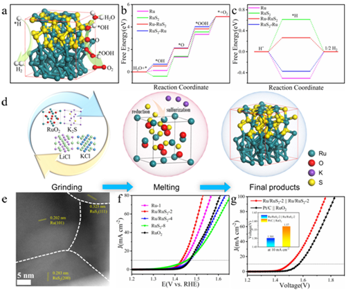 對此,木士春教授團隊對Ru基異質(zhì)介面的電子結構、活性起源及酸性析氫、析氧及全水解電催化性能進行了深入探究。首先,通過密度泛函理論(DFT)理論計算發(fā)現(xiàn)釕/二硫化釕(Ru/RuS2)異質(zhì)介面具有較高的電子態(tài),且其界面上存在明顯的電荷轉移趨勢,使得表面Ru原子對催化中間體的吸附能得到優(yōu)化,從而降低了反應能壘,提高了本征活性。繼而,利用熔鹽體系下硫化鉀的同步還原與硫化作用,獲得了新穎的Ru/RuS2異質(zhì)介面結構催化材料。電化學測試表明,在酸性介質(zhì)下,Ru/RuS2展示出極低的析氧(201 mV @ 10 mA cm-2)、析氫過電位(45 mV @ 10 mA cm-2)及優(yōu)異的循環(huán)穩(wěn)定性。將其用于質(zhì)子交換膜電解水系統(tǒng)時,僅需1.501 V電壓值就可達到10 mA cm-2的電流密度。該項研究成果將為異質(zhì)界面結構的理性設計與可控構筑提供指導。