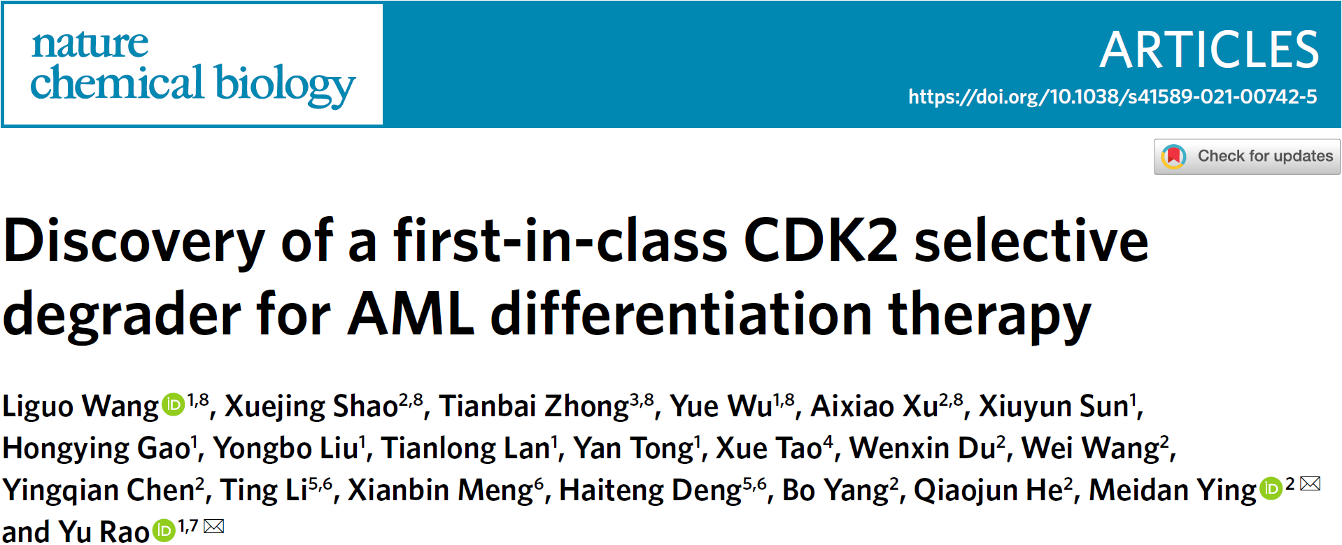 [1] 最新研究成果 | 清華大學(xué)饒燏團(tuán)隊(duì)與浙江大學(xué)應(yīng)美丹團(tuán)隊(duì)在《Nature Chemical Biology》發(fā)表CDK2降解劑的設(shè)計(jì)及在AML分化治療中的應(yīng)用研究http://www.sps.tsinghua.edu.cn/cn/news/achievement/2021/0305/718.html