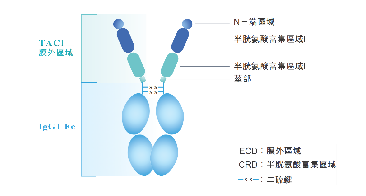 泰它西普(RC18,商品名:泰愛)是榮昌生物專有用于治療自身免疫性疾病的新型融合蛋白,由人跨膜激活劑及鈣調(diào)親環(huán)素配體相互作用因子(TACI)受體的胞外域以及人免疫球蛋白G (IgG)的可結(jié)晶片段(Fc)域構(gòu)成。泰它西普靶向兩類對B淋巴細胞發(fā)育至關(guān)重要的細胞信號分子:B淋巴細胞刺激因子(BLyS)和增殖誘導(dǎo)配體(APRIL),得以有效降低B細胞介導(dǎo)的自身免疫應(yīng)答,自身免疫應(yīng)答與多種自身免疫性疾病有關(guān)。