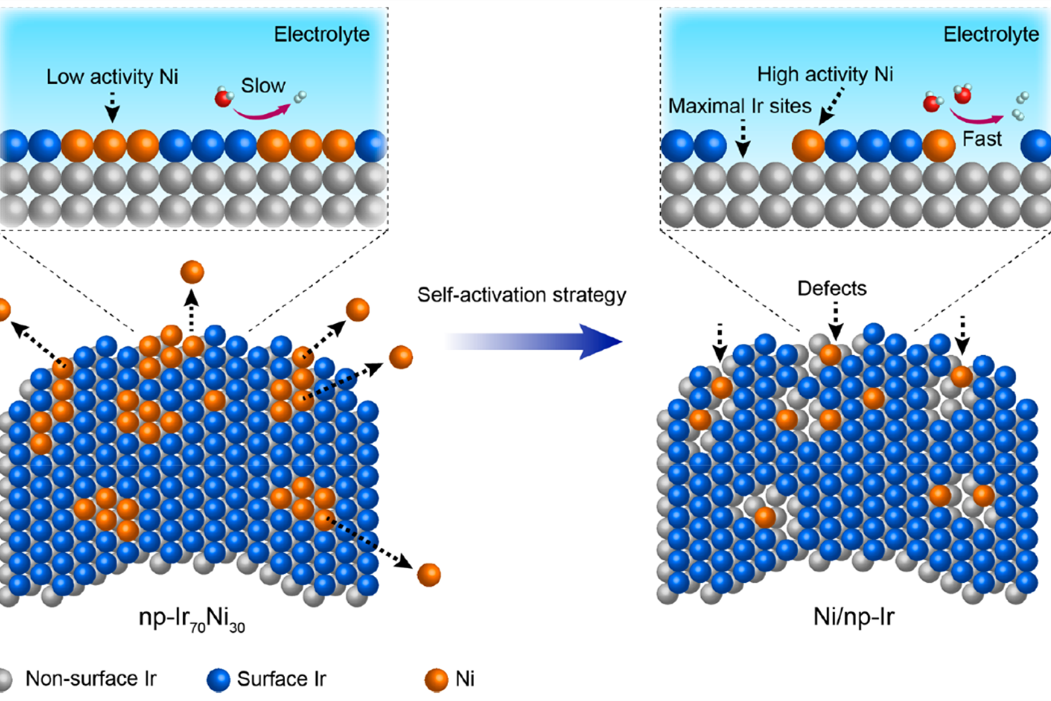 此外,譚勇文教授團隊通過一種自活化的策略將修飾物種(Ni)的尺寸降低到原子層次,最大化催化劑中貴金屬原子的利用率(圖三)。得益于此,制備出的原子級Ni摻雜納米多孔Ir催化劑具有優(yōu)越的HER催化活性,優(yōu)于目前報道的最先進的催化劑和市售催化劑(Pt/C和Ir/C)。進一步的原位XAS和密度泛函理論計算(DFT)表明,原子級的Ni位點不僅在實際反應(yīng)條件下作為水裂解的高活性位點,同時能調(diào)節(jié)Ir位點的電子結(jié)構(gòu),從而降低了H-H耦合的能壘。國際知名材料期刊《ACS Nano》于近期在線發(fā)表了譚勇文教授團隊題為“Self-Activated Catalytic Sites on Nanoporous Dilute Alloy for High-Efficiency Electrochemical Hydrogen Evolution”的納米多孔單原子合金領(lǐng)域研究成果。碩士研究生余雅倩,博士研究生蔣康為該論文的共同第一作者。