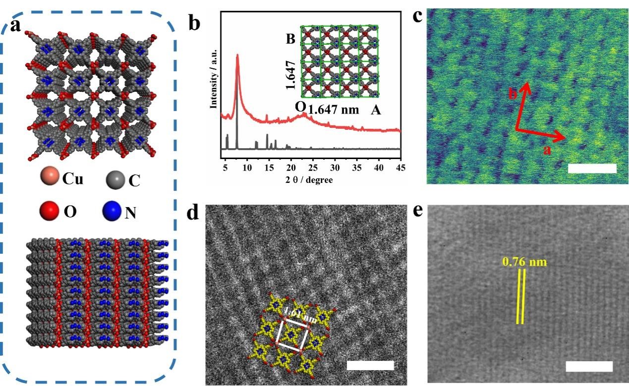 圖1 (a) 二維Cu2(TCPP) MOFs的結(jié)構(gòu)示意圖;(b) XRD;(c) HRAFM圖像;(d) (100)面的Cryo-TEM圖像;(e) (001)面的Cryo-TEM圖像。