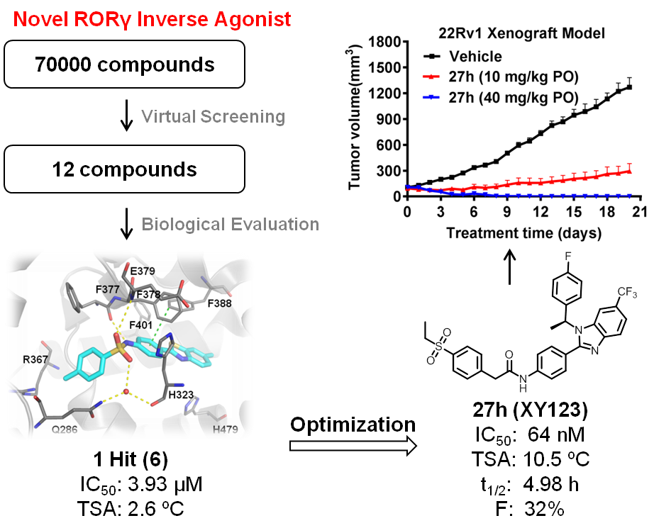 近期,該團(tuán)隊(duì)通過虛擬篩選、基于結(jié)構(gòu)的藥物設(shè)計(jì)和構(gòu)效關(guān)系研究,獲得了一系列苯并咪唑類RORγ小分子抑制劑,這些化合物對(duì)RORγ表現(xiàn)出顯著的抑制活性。代表性化合物XY123可有效抑制RORγ的轉(zhuǎn)錄活性(IC50 = 64 nM),增強(qiáng)RORγ-LBD的熱穩(wěn)定性(ΔTm = 10.5 °C)。同時(shí),XY123具有優(yōu)越的選擇性、良好的代謝穩(wěn)定性和藥代動(dòng)力學(xué)特性(t1/2 = 4.98 h,F(xiàn) = 32%)。另外,XY123也開展了前列腺癌活性評(píng)價(jià)及克服耐藥機(jī)制研究。結(jié)果顯示,XY123可以抑制多種前列腺癌細(xì)胞的增殖與克隆形成,同時(shí)可有效抑制前列腺癌細(xì)胞中AR調(diào)控的下游基因的表達(dá)。XY123還可有效抑制前列腺癌細(xì)胞中AR全長和AR突變體的表達(dá)。在22Rv1異種移植的前列腺癌小鼠模型中,通過口服給藥XY123可實(shí)現(xiàn)腫瘤的長期完全消退。XY123可作為一個(gè)有前景的先導(dǎo)化合物用于前列腺癌及其臨床耐藥藥物的開發(fā)。