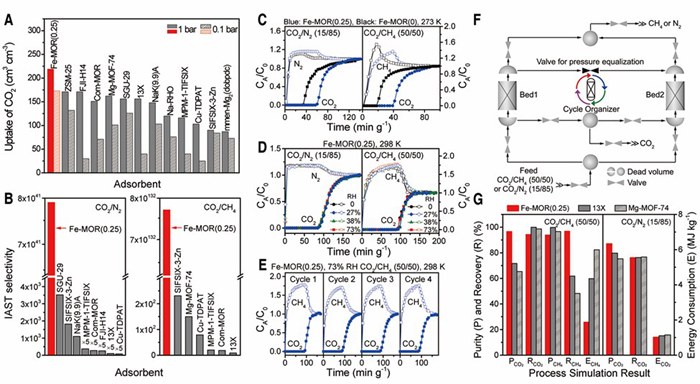 (上)雜原子絲光沸石一維孔道篩分CO2, Ar, N2和CH4的示意圖。(下)氣體吸附分離性能:(A) 298 K時(shí)CO2體積吸收量;(B) CO2/N2:15/85和CO2/CH4:50/50二元混合物在1 bar和298 K下的CO2/N2和CO2/CH4分離選擇性;(C-E) CO2/N2(CH4)穿透曲線;(F) 2-床VSA工藝的流程示意圖和(G) ASPEN模擬結(jié)果。