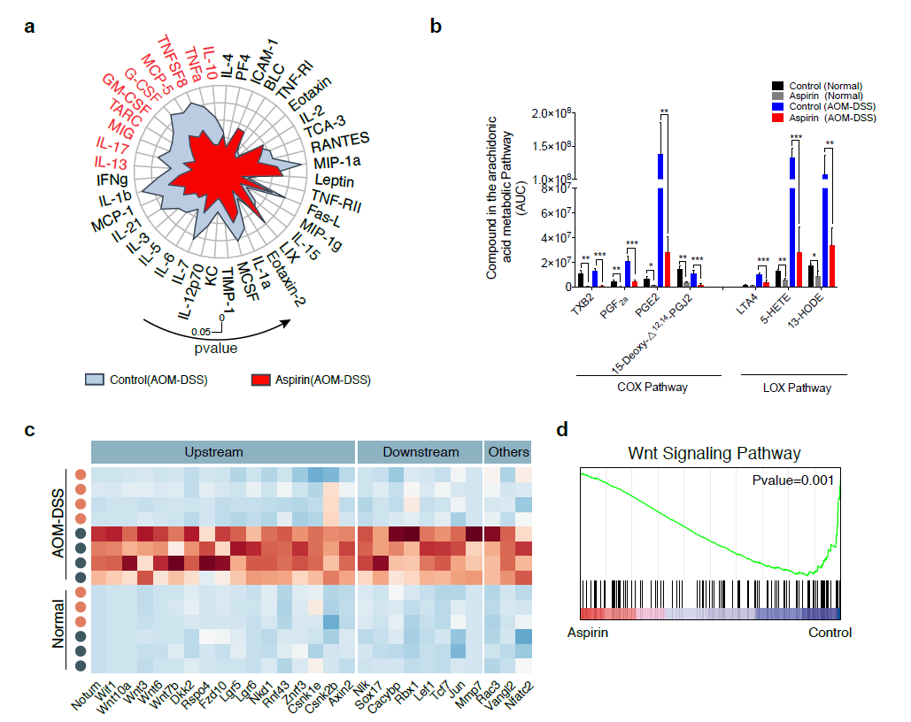 在本篇研究中,我們通過運用多組學(xué)手段,從細(xì)胞因子、代謝物、基因及蛋白表達(dá)等層面,廣泛而完整的評估了阿司匹林對腫瘤發(fā)生及細(xì)胞增殖的影響。