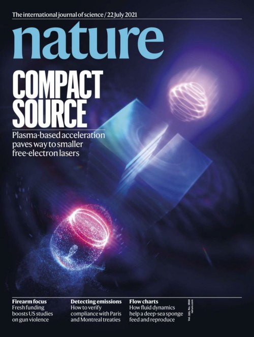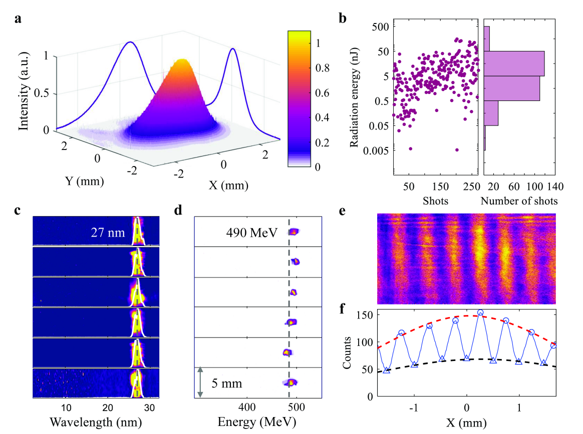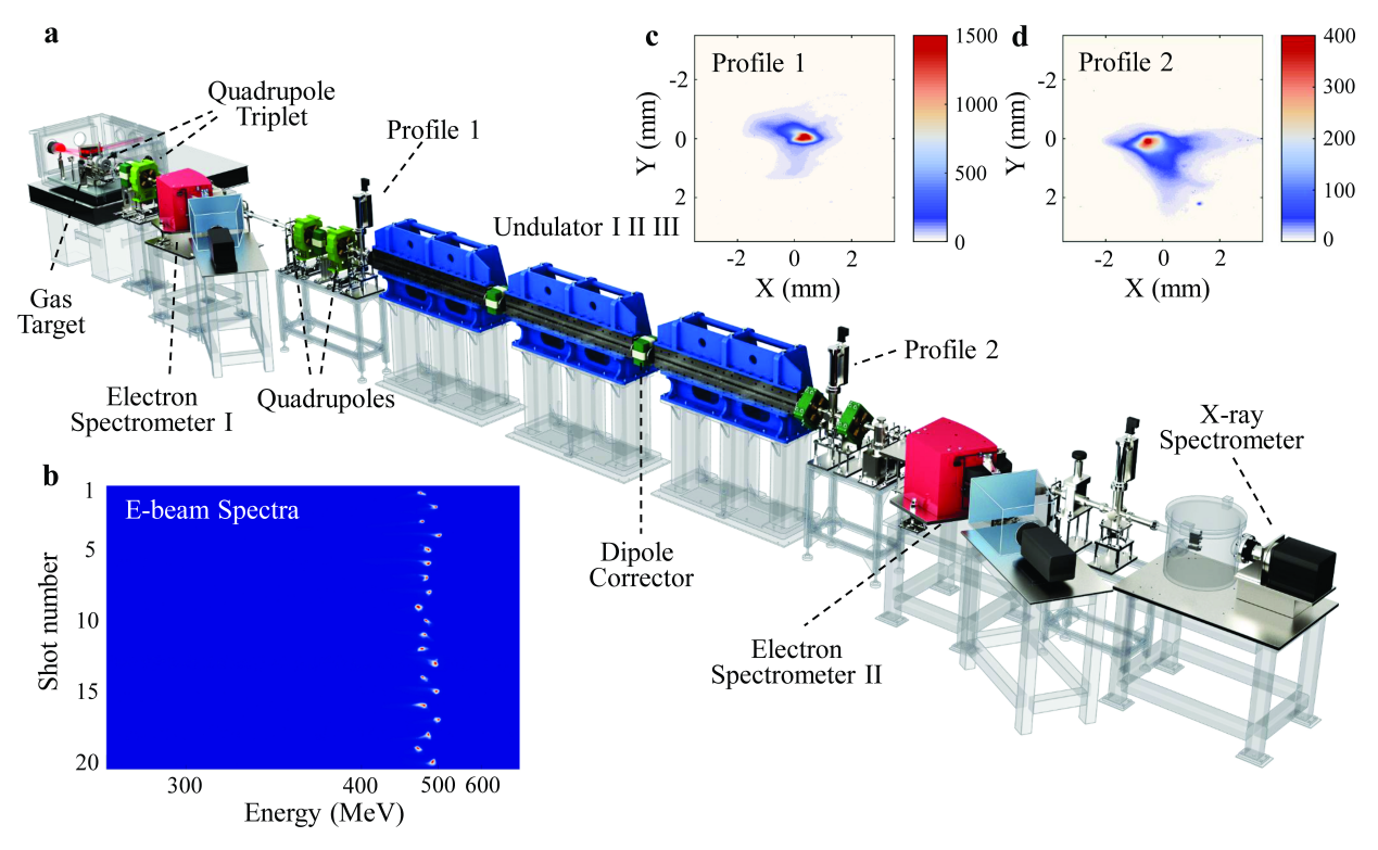 中國(guó)科學(xué)院上海光學(xué)精密機(jī)械研究所強(qiáng)場(chǎng)激光物理國(guó)家重點(diǎn)實(shí)驗(yàn)室,利用自行研制的具有國(guó)際領(lǐng)先綜合性能的超強(qiáng)超短激光裝置,在基于激光加速器的小型化自由電子激光研究方面取得突破性進(jìn)展。研究團(tuán)隊(duì)通過(guò)顯著提升激光尾波場(chǎng)加速的電子束品質(zhì),并結(jié)合創(chuàng)新設(shè)計(jì)的緊湊型束流傳輸與輻射系統(tǒng),實(shí)驗(yàn)上首次實(shí)現(xiàn)了基于激光加速器的自由電子激光放大輸出,典型激光波長(zhǎng)27納米,最短激光波長(zhǎng)可達(dá)10納米級(jí),單脈沖能量可達(dá)100納焦級(jí),國(guó)際率先完成了臺(tái)式化自由電子激光原理的實(shí)驗(yàn)驗(yàn)證,對(duì)于發(fā)展小型化、低成本自由電子激光器具有重大意義。相關(guān)研究成果于2021年7月22日作為封面文章發(fā)表于《自然》(Nature)雜志。