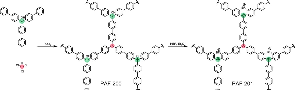 三苯甲基碳正離子鹽已經(jīng)作為路易斯酸催化劑和氧化劑在有機(jī)合成中使用多年。但由于其價格較貴和回收困難,其應(yīng)用一直受到限制。針對此問題,卞證教授和朱廣山教授等以三聯(lián)苯甲醇和氯仿為底物,通過Friedel-Crafts烷基化反應(yīng)合成了基于三苯甲醇的多孔芳香骨架PAF-200,并在四氟硼酸作用下,獲得主要基于三苯甲基碳正離子的多孔芳香骨架PAF-201(圖1),期望其具有小分子碳正離子性質(zhì)且易回收使用。