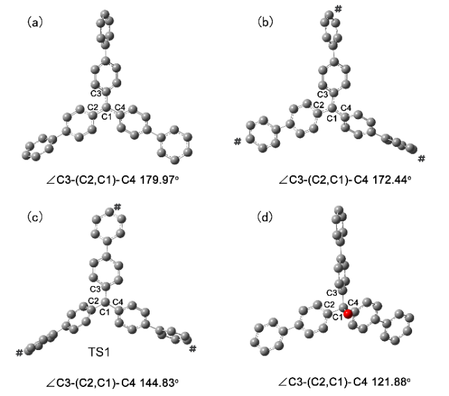 圖2. The optimized energy minimum structures of free (a) and fixed (b) tri(4-biphenyl)carbonium, and TS1 of fixed tri(4-biphenyl)carbonium interacting with imine (c), and tri(4-biphenyl)carbinol (d).
