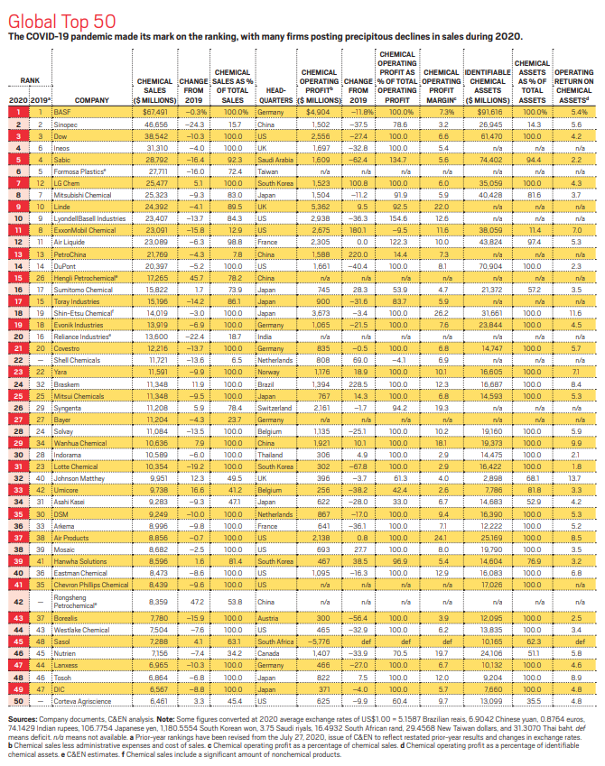 盡管去年的數(shù)據(jù)波動(dòng)很大,但上榜企業(yè)變化不大,擁有大量石化業(yè)務(wù)的公司普遍出現(xiàn)銷售下滑,排名也有所下降。制造工業(yè)氣體或農(nóng)用化學(xué)品的公司上升明顯。