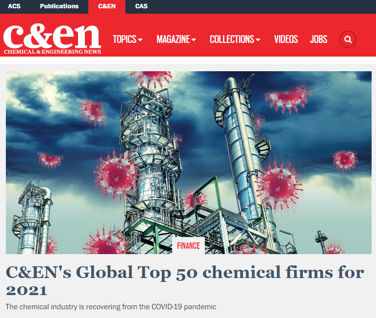 7月26日,美國《化學(xué)與工程新聞》(C&EN)發(fā)布2021年全球化工企業(yè)50強(qiáng)名單。前三甲位置穩(wěn)固,巴斯夫依舊是全球最大的化學(xué)品制造商;中石化連續(xù)第二年位居亞軍;季軍仍為陶氏化學(xué)。榮盛石化首次上榜,位居第42名。