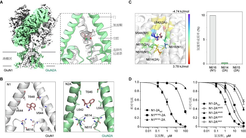 圖注(A)結(jié)合氯胺酮的人源GluN1-GluN2A NMDA受體冷凍電鏡三維結(jié)構(gòu)。(B)氯胺酮結(jié)合位點空腔里的關(guān)鍵氨基酸。(C)分子動力學(xué)模擬過程中氯胺酮周圍氨基酸的結(jié)合能貢獻和氫鍵形成的頻率。(D)野生型和關(guān)鍵位點突變的NMDA受體的氯胺酮劑量效應(yīng)曲線。
