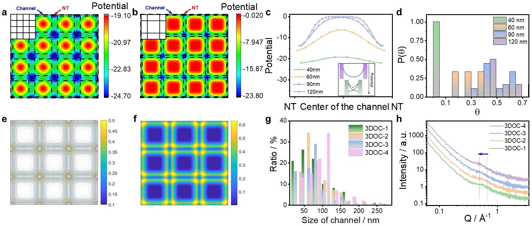研究人員選取鉑納米管(Pt NTs)為模型催化劑,利用氣液界面組裝和原位電化學(xué)刻蝕活化策略構(gòu)筑了理想的最大程度暴露活性面的三維有序通道結(jié)構(gòu)(3DOC),并選取甲醇氧化反應(yīng)(MOR)作為模型反應(yīng)對其電催化性能進(jìn)行了測試。通過調(diào)節(jié)三維通道的尺寸大小,研究人員發(fā)現(xiàn)存在最佳的尺寸使得甲醇氧化性能最高,比傳統(tǒng)滴涂形成的雜亂分布的催化劑性能提升近2倍。研究人員從電極表面的自由能密度函數(shù)出發(fā),建立了一個全動力學(xué)模型,對不同孔徑通道內(nèi)甲醇分子的電勢分布、傳輸速率、濃度分布以及三維通道的上下電子輸運進(jìn)行了模擬。結(jié)果表明,三維通道尺寸增大將極大地避免催化劑表面雙電層的交疊,從而促進(jìn)甲醇分子從體相電解質(zhì)到催化劑表面雙電層的傳質(zhì)過程(圖2)。