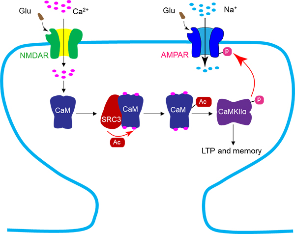 圖1 SRC3乙?;}調(diào)蛋白CaM調(diào)節(jié)突觸可塑性和學(xué)習(xí)記憶。神經(jīng)活動(dòng)激活NMDA受體,Ca2+內(nèi)流引起SRC3乙?;?/span>CaM,Ac-CaM更強(qiáng)地激活CaMKIIα,從而調(diào)控海馬長(zhǎng)時(shí)程增強(qiáng)和場(chǎng)景恐懼記憶。