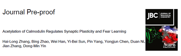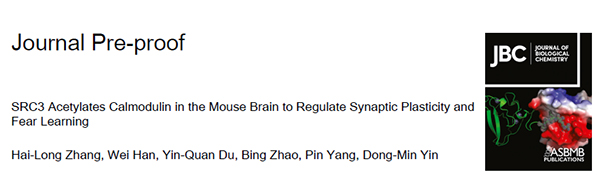 第二部分研究成果以“SRC3 Acetylates Calmodulin in the Mouse Brain to Regulate Synaptic Plasticity and Fear Learning”為標(biāo)題,在線發(fā)表于美國(guó)生物化學(xué)與分子生物學(xué)會(huì)刊,自然指數(shù)收錄期刊《Journal of Biological Chemistry》。華東師范大學(xué)生命科學(xué)學(xué)院博士生張海龍(現(xiàn)為蘇州大學(xué)師資博士后)、韓威、碩士生杜銀權(quán)為論文的共同第一作者,殷東敏研究員為論文的通訊作者(圖2)。這兩篇論文首次揭示了鈣調(diào)蛋白(CaM)乙?;墓δ芗罢{(diào)控機(jī)制,可能對(duì)鈣離子(Ca2+)信號(hào)轉(zhuǎn)導(dǎo)的研究帶來(lái)新的視角。鑒于以上工作的重要性,這兩篇論文被JBC的主編選為“重點(diǎn)推薦”論文(Editors’ Picks),JBC雜志將在線配發(fā)專(zhuān)門(mén)的評(píng)論文章,上述研究成果也將在美國(guó)生物化學(xué)和分子生物學(xué)會(huì)的官方網(wǎng)站以新聞形式發(fā)布(Press Release)。