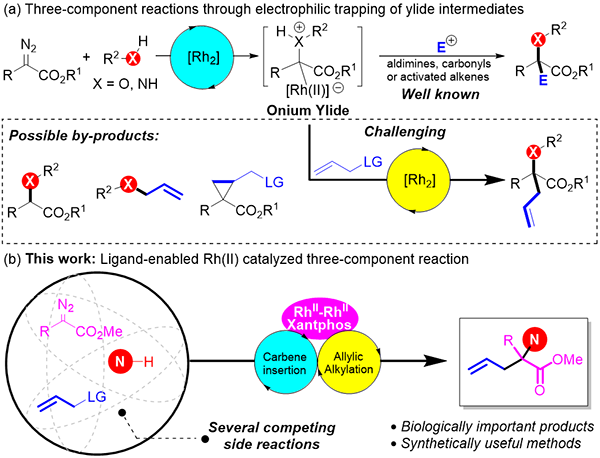 雙核銠化合物催化的卡賓轉(zhuǎn)移反應得到廣大科研工作者的關注。近年來,國內(nèi)外多個課題組,包括周其林院士、胡文浩教授、王劍波教授、Davies教授和Doyle教授等,在該領域均做出了突出的貢獻。其中雙核銠催化的重氮化合物參與的多組份反應可從簡單的原料出發(fā),簡便快捷地構建多個化學鍵,具有高合成效率和高原子經(jīng)濟性等特點。然而通過烯丙基金屬銠中間體來引入烯丙基官能團,在該類多組份反應中一直是一個挑戰(zhàn)。通常認為雙核銠(II)很難通過雙電子氧化加成過程活化烯丙基化合物來獲得烯丙基銠中間體。此外,諸多的副反應(如直接的兩組份烯丙基取代反應、環(huán)丙烷化反應等)均可能發(fā)生,給三組份反應的實現(xiàn)帶來了困難。研究團隊發(fā)現(xiàn),Rh2(Oct)4/Xantphos的組合可以有效實現(xiàn)卡賓轉(zhuǎn)移/烯丙基烷基化的接力過程,完成胺、重氮化合物與烯丙基化合物的有序“組裝”,并且有效避免了多種可能副產(chǎn)物的生成。該催化體系具有較為廣譜的底物適用范圍和良好的官能團兼容性,比如BocNH2或含有芳胺結構的藥物分子以及一些天然產(chǎn)物衍生的重氮底物,都能夠很好地轉(zhuǎn)化為目標產(chǎn)物。此外,反應獲得的一些產(chǎn)物是合成NK1受體拮抗劑或藥物分子BMS-561392的重要中間體。