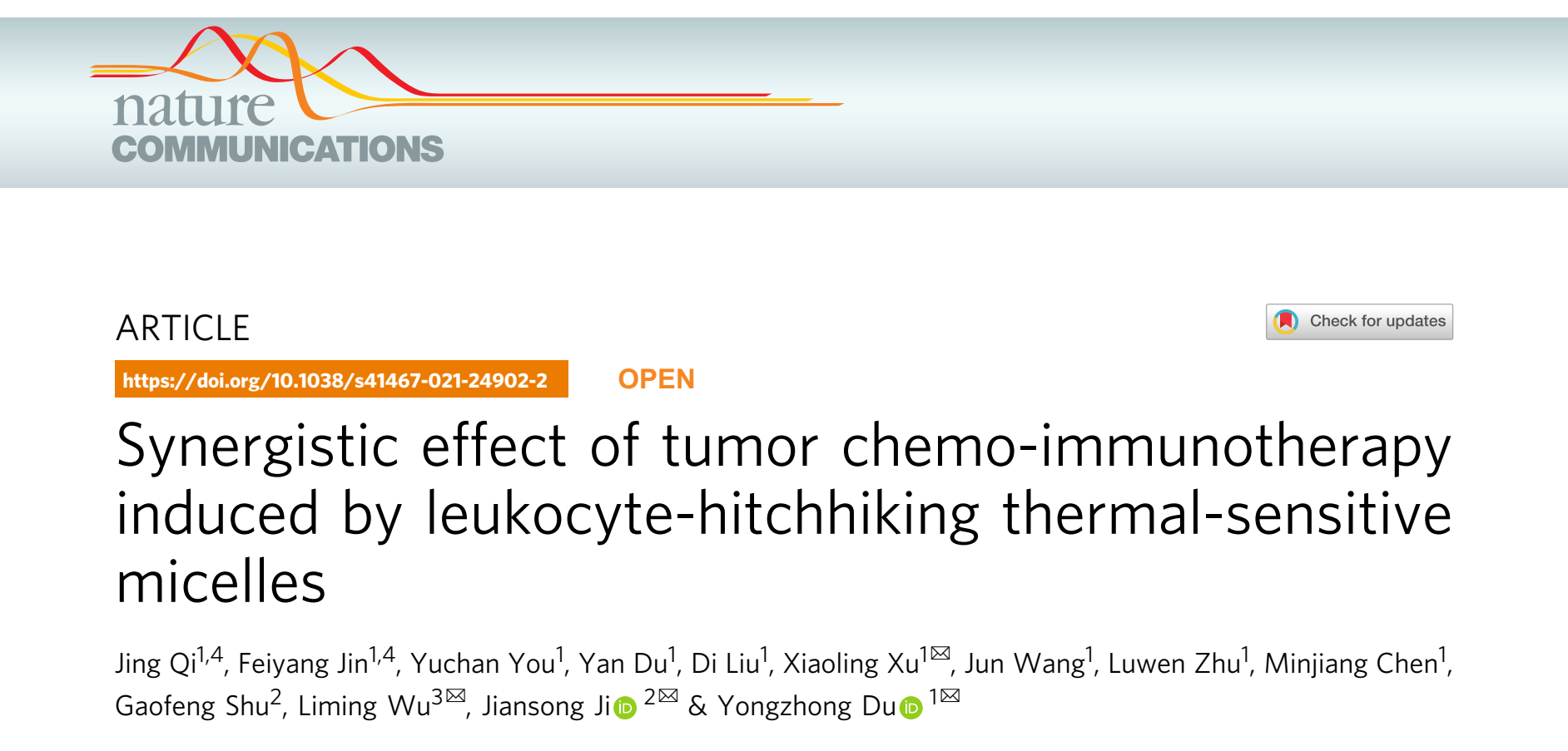 杜永忠教授致力于新型納米給藥系統的開發(fā)及腫瘤靶向免疫治療研究,課題組近年來在Angewandte Chemie International Edition、Nano Letters、Biomaterials、 Journal of Controlled Release、ACS Applied Materials & Interface等國際著名期刊發(fā)表多項原創(chuàng)性工作。本研究在前期工作的基礎上,針對上述矛盾,設計了一種共載ICD誘導劑阿霉素和A2AR拮抗劑SCH 58261的溫敏性膠束,并在表面修飾E-選擇素,靜脈注射后可在E-選擇素的介導下粘附在白細胞的表面,隨白細胞一同遷移至腫瘤部位,實現納米粒的腫瘤高度富集,還解決了人工合成納米粒易被網狀內皮系統捕獲、難以穿透生物屏障等問題。