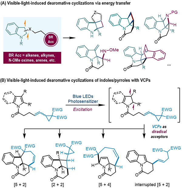 可見光是一種清潔環(huán)保的可再生資源??梢姽獯呋磻?yīng)因其迥異于熱化學(xué)轉(zhuǎn)化的反應(yīng)行為,近年來在有機(jī)合成中得到了廣泛的應(yīng)用。值得注意的是,將可見光誘導(dǎo)的能量轉(zhuǎn)移過程與去芳構(gòu)化反應(yīng)相結(jié)合,可在溫和的反應(yīng)條件下高效地構(gòu)建復(fù)雜三維分子骨架。中科院上海有機(jī)所金屬有機(jī)化學(xué)國家重點(diǎn)實(shí)驗(yàn)室游書力研究員團(tuán)隊(duì)一直致力于發(fā)展可見光介導(dǎo)的去芳構(gòu)化反應(yīng)。在前期工作中該團(tuán)隊(duì)發(fā)現(xiàn),在可見光的照射和光敏劑存在條件下吲哚衍生物可通過能量轉(zhuǎn)移機(jī)制激發(fā)至三重態(tài),并與分子內(nèi)烯烴、炔烴發(fā)生[2+2]環(huán)加成反應(yīng),構(gòu)建含環(huán)丁烷或環(huán)丁烯單元的吲哚啉衍生物(J. Am. Chem. Soc. 2019, 141, 2636, CCS Chem. 2020, 2, 652);與N-甲氧基肟醚發(fā)生[2+2]環(huán)加成反應(yīng)或1,5-氫原子轉(zhuǎn)移反應(yīng),構(gòu)建吲哚啉并氮雜環(huán)丁烷和indolizidine類衍生物(ACS Catal. 2020, 10, 12618);與另一芳香環(huán)發(fā)生雙去芳構(gòu)化[4+2]或[2+2]環(huán)加成反應(yīng),實(shí)現(xiàn)了一系列結(jié)構(gòu)新穎的三維分子結(jié)構(gòu)的構(gòu)建(Angew. Chem. Int. Ed. 2021, 60, 7036)(圖1A)。