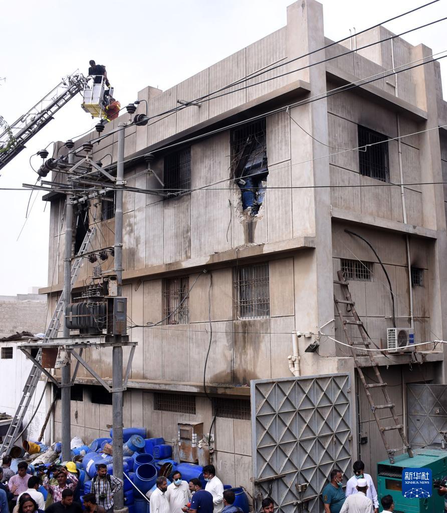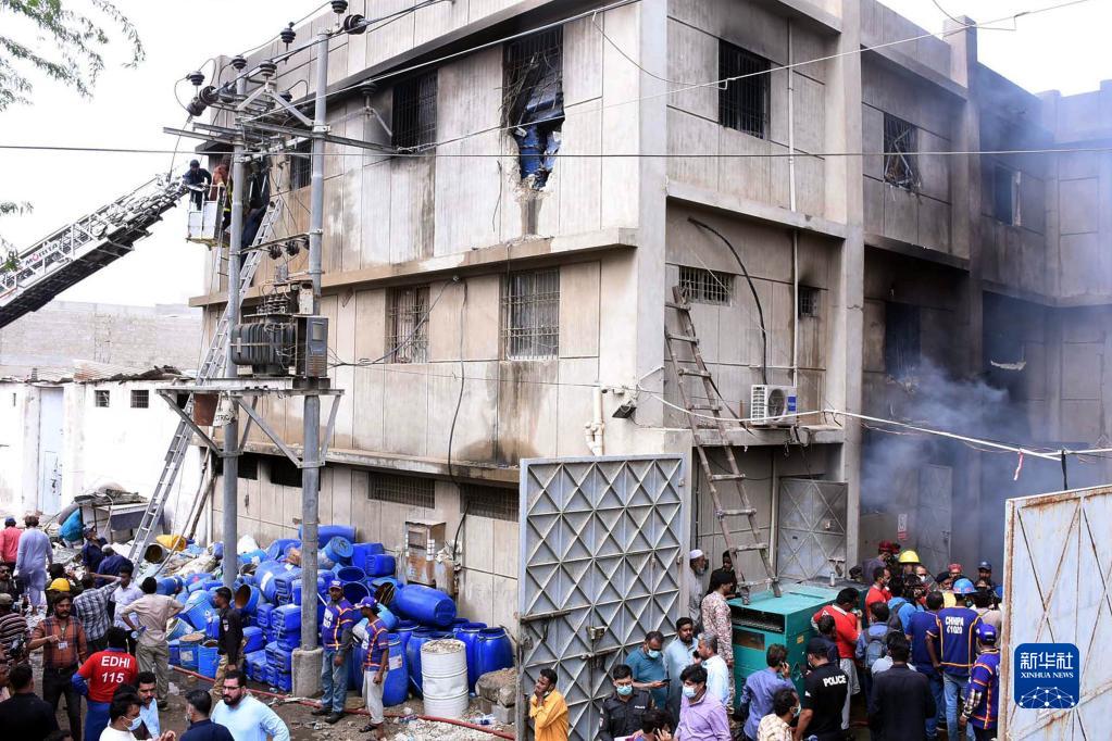 8月27日,消防員在巴基斯坦卡拉奇的火災現(xiàn)場工作。新華社發(fā)