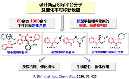 石楓教授課題組一直致力于手性雜環(huán)化學(xué)的研究,近年來聚焦于手性吲哚化學(xué)。針對手性吲哚化學(xué)的關(guān)鍵科學(xué)問題,該課題組采用了獨(dú)特的研究策略——設(shè)計新型吲哚平臺分子及其參與的催化不對稱新反應(yīng),實(shí)現(xiàn)了具有挑戰(zhàn)性的新型手性吲哚骨架的高效、高選擇性構(gòu)建,為手性吲哚化合物的應(yīng)用研究提供了高效的合成方法學(xué)和豐富的化合物庫。該課題組還探究了該類反應(yīng)的機(jī)制、催化模式、產(chǎn)物的生物活性和催化作用,發(fā)現(xiàn)了以2-吲哚甲醇極性反轉(zhuǎn)為代表的吲哚新化學(xué),推動了手性吲哚化學(xué)的發(fā)展,2020年受邀為國際知名期刊Acc.Chem. Res.作綜述(圖1)。