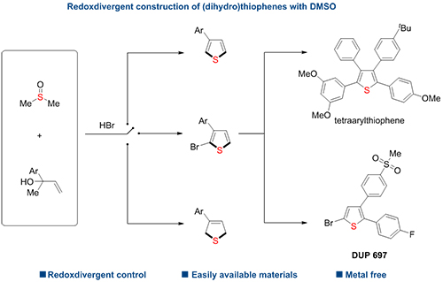 陳慶安團(tuán)隊(duì)一直致力于發(fā)展不同催化體系,以實(shí)現(xiàn)烯烴選擇性催化轉(zhuǎn)化與合成。在前期相關(guān)研究(Angew. Chem. Int. Ed.,2019;Angew. Chem. Int. Ed.,2020;Angew. Chem. Int. Ed. 2021;Angew. Chem. Int. Ed.,2021)的基礎(chǔ)上,最近,該團(tuán)隊(duì)利用二烯前體烯丙醇和DMSO、HBr為原料,采用氧化還原發(fā)散性的策略構(gòu)建噻吩和二氫噻吩。團(tuán)隊(duì)通過簡(jiǎn)單地改變DMSO和HBr的用量來調(diào)控氧化還原程度,從而得到不同氧化還原態(tài)的產(chǎn)物。此外,團(tuán)隊(duì)還進(jìn)行一系列控制實(shí)驗(yàn)和動(dòng)力學(xué)研究,解釋了反應(yīng)的機(jī)理和氧化還原態(tài)控制的原因。為了進(jìn)一步驗(yàn)證該反應(yīng)的實(shí)用性,團(tuán)隊(duì)還進(jìn)行了一系列的轉(zhuǎn)化實(shí)驗(yàn),利用(二氫)噻吩產(chǎn)物,能夠得到一系列五元含硫雜環(huán)化合物,尤其是能快速地程序化合成不同四芳基取代的噻吩、環(huán)氧合酶-2(COX-2)抑制劑DUP 697及其區(qū)域異構(gòu)體。