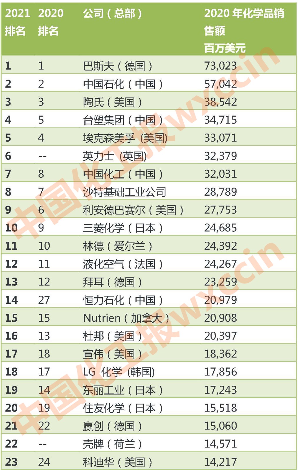 2020年,僅有巴斯夫和中國石化銷售收入超過500億美元;300億~400億美元的公司有5家,分別為陶氏化學、臺塑、??松梨?、英力士、中國化工。200億~300億美元的有9家;42家公司銷售收入高于100億美元。