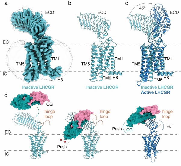 該研究首次揭示了全長(zhǎng)LHCGR的結(jié)構(gòu),以及CG與LHCGR相互作用的細(xì)節(jié)。研究人員通過(guò)大量嘗試,克服了全長(zhǎng)失活受體構(gòu)象高度不穩(wěn)定的技術(shù)難題,最終解析了失活狀態(tài)下全長(zhǎng)LHCGR的電鏡結(jié)構(gòu),分辨率為3.8埃。通過(guò)對(duì)比激活LHCGR結(jié)構(gòu),研究人員發(fā)現(xiàn)受體的ECD發(fā)生了大約45度的偏轉(zhuǎn)。通過(guò)進(jìn)一步結(jié)構(gòu)分析和功能試驗(yàn)驗(yàn)證,最終提出了LHCGR受體“Push and Pull”的受體激活模型(圖2)。這也是第一個(gè)全長(zhǎng)單獨(dú)GPCR的電鏡結(jié)構(gòu)。