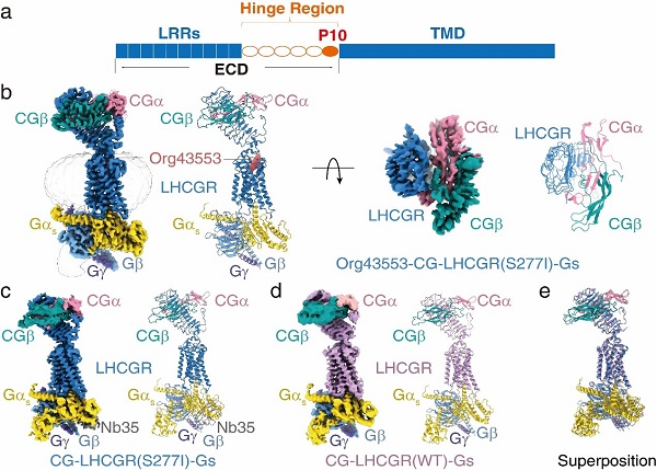 聯(lián)合研究團(tuán)隊(duì)采用單顆粒冷凍電鏡技術(shù),首次解析了3個(gè)近原子分辨率的全長(zhǎng)LHCGR處于激活狀態(tài)下的結(jié)構(gòu)(圖1),包括結(jié)合內(nèi)源性激素CG的LHCGR(野生型)受體結(jié)構(gòu)(4.3埃)、結(jié)合內(nèi)源性激素CG的LHCGR(含持續(xù)性激活突變S277I)受體結(jié)構(gòu)(3.8埃)以及結(jié)合內(nèi)源性激素CG和小分子化合物Org43553的LHCGR(含持續(xù)性激活突變S277I)受體結(jié)構(gòu)(3.2埃)。