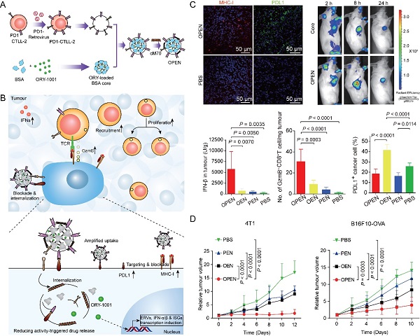 圖1:(A). PD1過表達(dá)CTLL-2細(xì)胞的構(gòu)建和負(fù)載ORY-1001納米囊泡(OPEN)的制備。(B). OPEN被腫瘤細(xì)胞PDL1識(shí)別并入胞,上調(diào)IFN表達(dá),增加腫瘤微環(huán)境內(nèi)T細(xì)胞浸潤并促進(jìn)CTL活化,同時(shí)阻斷PDL1介導(dǎo)的免疫逃逸。(C). OPEN特異性靶向腫瘤,顯著上調(diào)瘤內(nèi)IFN表達(dá),促進(jìn)抗原遞呈,提高腫瘤中細(xì)胞毒性T細(xì)胞浸潤并有效解除ORY-1001造成的免疫抑制。(D). OPEN顯著抑制乳腺癌和黑色素瘤的生長。