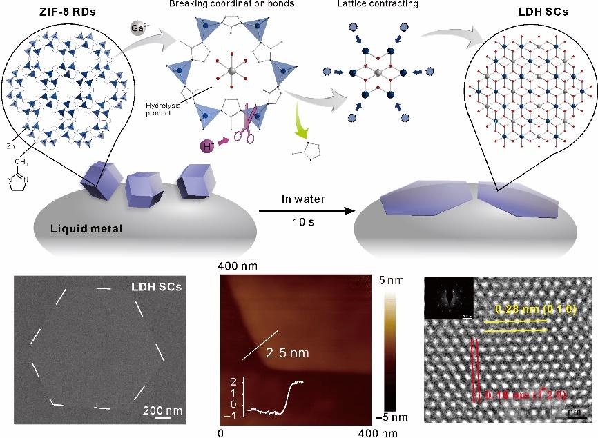 課題組利用液態(tài)金屬鎵(Ga)和母體晶體之間的相互作用,實(shí)現(xiàn)了從三維金屬有機(jī)框架化合物到二維層狀雙金屬氫氧化物之間速度超快、結(jié)構(gòu)大幅變化的單晶—單晶轉(zhuǎn)變,整個(gè)過程僅需10秒。轉(zhuǎn)變后的子體單晶繼承了母體單晶的有序的金屬原子排列,這意味著可以通過調(diào)控母體單晶中金屬組成來設(shè)計(jì)合成含有多種金屬元素的氫氧化物。此外通過單晶—單晶轉(zhuǎn)變制備得到的二維層狀雙金屬氫氧化物同時(shí)具有超薄和高結(jié)晶性的優(yōu)勢(shì),使其光催化二氧化碳還原的活性得到明顯提升。這種獨(dú)特的單晶轉(zhuǎn)變引發(fā)了對(duì)晶體轉(zhuǎn)變機(jī)制的思考,極大地拓展了單晶—單晶轉(zhuǎn)變領(lǐng)域的研究范圍,同時(shí)也為制備高結(jié)晶性的二維材料提供了新思路。