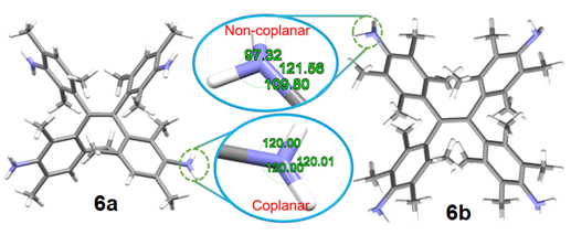 由于氨基上孤對(duì)電子與周圍成鍵電子的排斥力,孤對(duì)電子會(huì)把氮原子生成的三個(gè)共價(jià)鍵擠壓在一起,使氨、氨基及胺呈現(xiàn)錐形結(jié)構(gòu)。即使氨基的孤對(duì)電子與苯環(huán)共軛,仍然是錐形結(jié)構(gòu),只不過(guò)其錐形有所拉平,氮原子仍然是sp3雜化,這是所有有機(jī)化學(xué)和無(wú)機(jī)化學(xué)教科書中所介紹的基本知識(shí)。該課題組為了得到性能優(yōu)異的手性熒光分子,利用2,6-位二甲基取代的二苯基乙烯酮經(jīng)光分解偶合得到了構(gòu)象完全固定的位阻型TPE螺旋體,經(jīng)反應(yīng)條件優(yōu)化,偶合產(chǎn)率從19%提高到50%以上,苯環(huán)容易修飾,并拆分出對(duì)映體。晶體結(jié)構(gòu)測(cè)試發(fā)現(xiàn),TPE四胺螺旋體6a的氨基兩個(gè)氫原子與苯環(huán)處在同一個(gè)平面,氨基三個(gè)鍵之間的夾角都為120o, 因此氨基是一個(gè)氮原子為sp2雜化的平面結(jié)構(gòu),這是首次發(fā)現(xiàn)氨基具有平面結(jié)構(gòu)。然而,6b的氨基是正常的錐形構(gòu)象。6a氨基的平面結(jié)構(gòu)表明其孤對(duì)電子與苯環(huán)完全共軛,在固態(tài)下不會(huì)有孤對(duì)電子用于分子間的光致電子轉(zhuǎn)移(PET)過(guò)程,使其表現(xiàn)出AIE現(xiàn)象;而6b的氨基孤對(duì)電子沒(méi)有完全與苯環(huán)共軛,剩余的孤對(duì)電子會(huì)進(jìn)行分子間PET過(guò)程,表現(xiàn)出與AIE相反的ACQ效應(yīng)。