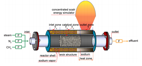 太陽能光熱驅(qū)動的蒸汽甲烷重整是實現(xiàn)能源脫碳、升級和利用的有效途徑,其中分布式太陽能熱化學(xué)反應(yīng)器(STR)被廣泛研究。STR是實現(xiàn)太陽能光-熱-化學(xué)轉(zhuǎn)化的關(guān)鍵部件。然而,目前的STR存在導(dǎo)熱性能差和受太陽能輻照度制約的問題。團隊提出一種基于高溫熱管的管式反應(yīng)器,突破目前制氫反應(yīng)器技術(shù)瓶頸,實現(xiàn)了太陽能光熱與光伏電的混合能源供應(yīng)的全時長產(chǎn)氫。