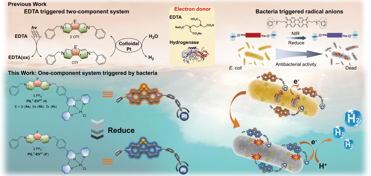 前期的研究表明,在光照下一定量的細(xì)菌也可以作為犧牲劑來促進(jìn)苝酰亞胺或紫精的還原。課題組開發(fā)了一系列含硫族元素紫精,此類材料具有較窄的能隙、可見光區(qū)的吸收和優(yōu)異的氧化還原性質(zhì),使其在可見光分解水產(chǎn)氫領(lǐng)域中可同時作為光敏劑和電子轉(zhuǎn)移劑使用,大大簡化了可見光催化體系,提高了產(chǎn)氫性能??梢灶A(yù)見,將鉑(II)配合物與含硫族元素紫精相結(jié)合,有望將光敏劑、電子轉(zhuǎn)移劑和催化劑的作用集于一身,實(shí)現(xiàn)高效的單組分可見光分解水制氫氣。此外,如果使用細(xì)菌作犧牲劑,在可見光照射下不僅可以實(shí)現(xiàn)細(xì)菌觸發(fā)的可見光分解水制氫氣,還可以同時實(shí)現(xiàn)抗菌作用。