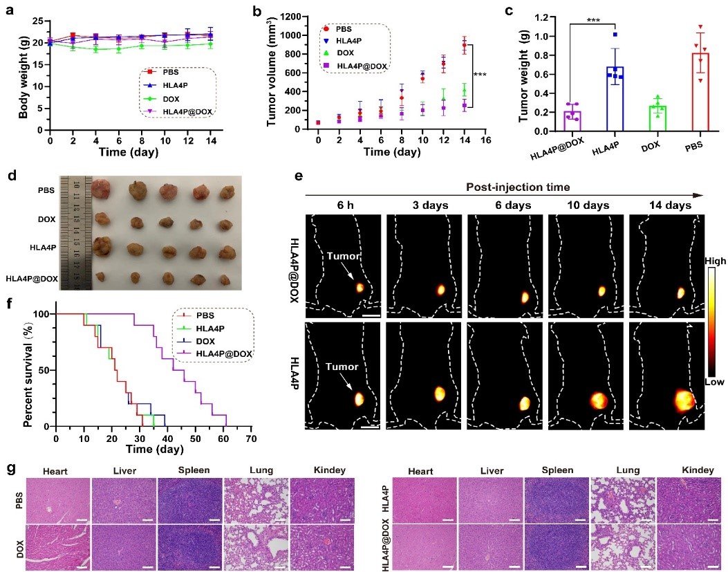 利用抗癌藥物抑制癌細胞生長和分裂的常規(guī)化療是癌癥治療的主要手段。大多數(shù)抗癌藥物是非選擇性的,不能在腫瘤組織中積累。為了提高化療藥的療效或減輕副作用,多種新型納米藥物遞送系統(tǒng)被開發(fā)用于癌癥治療。然而,抗癌納米藥物的體內(nèi)藥代動力學和給藥過程的有限數(shù)據(jù)阻礙了其臨床應用。一些近紅外熒光團已被廣泛用于標記藥物或跟蹤藥物吸收、代謝、分布和治療結(jié)果的反饋。然而,標記過程可能會改變原始藥物的物理和化學性質(zhì),導致成像結(jié)果與真實藥物代謝之間存在很大差異。因此,設計具有長血液循環(huán)和高腫瘤親和力的有機熒光藥物載體有重要的科學研究和應用價值。根據(jù)密度泛函理論設計、合成了一系列新型的噻吩并噻二唑NIR-II熒光團HLAn(n = 1–4),主鏈上的碳鏈從C0延伸到C12,光學能隙差可控調(diào)整為1.48 eV–1.77 eV。通過化學鍵修飾制備水溶性的熒光團HLAnP(n=1–4),自組裝成球形或棒狀膠束(1–200 nm)。HLA1P具有較短的血液半衰期,通過腎清除尿液排出;而HLAnP(n = 2–4)具有較長的血液半衰期(8.2 -70小時),最后緩慢通過肝膽清除,糞便排出。通過各種途徑(靜脈、腹腔、肌肉或皮下注射)給藥,HLA4P在體內(nèi)具有超長循環(huán)時間(t1/2 = 70 小時)、超高的成像信噪比(T/NT > 25)、超長腫瘤滯留時間(> 21天)、較少的網(wǎng)狀內(nèi)皮系統(tǒng)攝取和免疫原性。HLA4P可以有效地包載抗癌藥物阿霉素(DOX,包封率為65%),并實現(xiàn)DOX的可視化精準遞送和緩慢靶向釋放。HLA4P@DOX與游離DOX相比,藥物腫瘤滯留時間和藥物釋放可持續(xù)14天,表現(xiàn)出更好的治療效果和減少的心臟和腎毒副作用。HLA4P@DOX可以實現(xiàn)長時間實時活體腫瘤治療效果動態(tài)跟蹤、給藥分布和代謝NIR-II成像,本研究為診斷和治療雙功能應用的NIR-II熒光團的設計提供了新的視角。這些結(jié)果共同證明HLA4P作為一種新型NIR-II探針在精準藥物遞送和治療可視化上具有極大的潛力。
