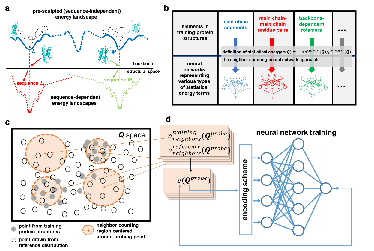圖1.用SCUBA模型進(jìn)行蛋白質(zhì)設(shè)計的原理。(a) SCUBA主鏈能量面上的極小對應(yīng)了蛋白質(zhì)的可設(shè)計主鏈結(jié)構(gòu),即特定氨基酸序列下的最低自由能結(jié)構(gòu);(b) SCUBA中用神經(jīng)網(wǎng)絡(luò)表示的統(tǒng)計能量項;(c)和(d) 用近鄰計數(shù)(NC)-神經(jīng)網(wǎng)絡(luò)(NN)方法從蛋白質(zhì)結(jié)構(gòu)原始數(shù)據(jù)中學(xué)習(xí)解析能量函數(shù)的方法框架。