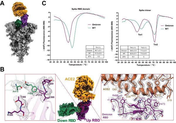 面對(duì)嚴(yán)峻的疫情防控形勢(shì),中科院上海藥物所徐華強(qiáng)和尹萬(wàn)超團(tuán)隊(duì)緊急攻關(guān),迅速解析Omicron變異株刺突蛋白以及結(jié)合人源受體ACE2的高分辨率冷凍電鏡結(jié)構(gòu)(圖1A和1B)。生化水平實(shí)驗(yàn)顯示,Omicron變異株刺突蛋白結(jié)合其受體ACE2相比于野生型有顯著的增強(qiáng),提高近10倍;從解析的結(jié)構(gòu)可以觀察到Omicron變異株刺突蛋白三聚體內(nèi)相鄰RBD特異的相互作用,形成的RBD二聚體(圖1B),可以穩(wěn)定Omicron變異株的刺突蛋白特定的RBD處于開(kāi)放的狀態(tài);熱動(dòng)力學(xué)實(shí)驗(yàn)顯示,Omicron變異株的RBD高度靈活,且不穩(wěn)定,其熱溶解溫度降低了超過(guò)5攝氏度(圖1C),使得刺突蛋白更容易從閉合構(gòu)象向開(kāi)放構(gòu)象轉(zhuǎn)換。Omicron變異株刺突蛋白R(shí)BD的相互作用及不穩(wěn)定性,促進(jìn)Omicron變異株刺突蛋白與ACE2的相互作用,從原子水平解釋了Omicron變異株傳染性增強(qiáng)的潛在機(jī)制。