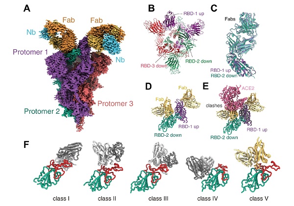 圖2 Omicron變異株新冠病毒刺突蛋白結(jié)合抗體JMB2002的結(jié)構(gòu)。A展示JMB2002抗體結(jié)合Omicron變異株刺突蛋白的整體結(jié)構(gòu),B為結(jié)合JMB2002抗體的結(jié)構(gòu)中Omicron變異株刺突蛋白的構(gòu)象,C為與JMB2002抗體結(jié)合的兩個(gè)RBD的結(jié)構(gòu)比較,D為JMB2002抗體結(jié)合Omicron變異株刺突蛋白的結(jié)構(gòu)中RBD-RBD的二聚體,E展示了結(jié)合的JMB2002抗體阻礙受體ACE2的識(shí)別,F(xiàn)為抗新冠病毒中和抗體的分類,JMB2002抗體為新型抗體,被歸為第五類。