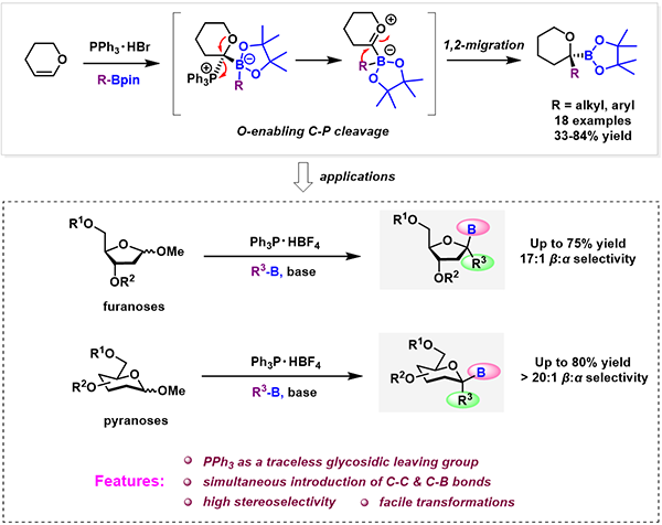 中科院天然產(chǎn)物有機(jī)合成化學(xué)重點(diǎn)實驗室何智濤課題組致力于不飽和烴的轉(zhuǎn)化及應(yīng)用領(lǐng)域。近期,何智濤課題組在J. Am. Chem. Soc.上在線發(fā)表了題為“Stereoselective gem-C,B-Glycosylation via 1,2-Boronate Migration”的研究論文(J. Am. Chem. Soc. 2022, doi.org/10.1021/jacs.1c11842)。該研究工作實現(xiàn)了無金屬參與的三苯基膦介導(dǎo)的烯烴的1,1-碳硼化反應(yīng),并將其應(yīng)用于立體選擇性的雙糖苷化修飾上,展現(xiàn)出潛在的應(yīng)用價值。