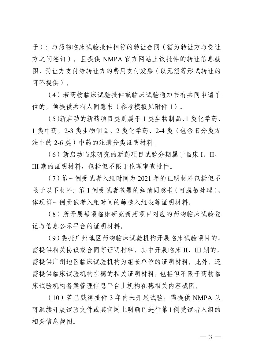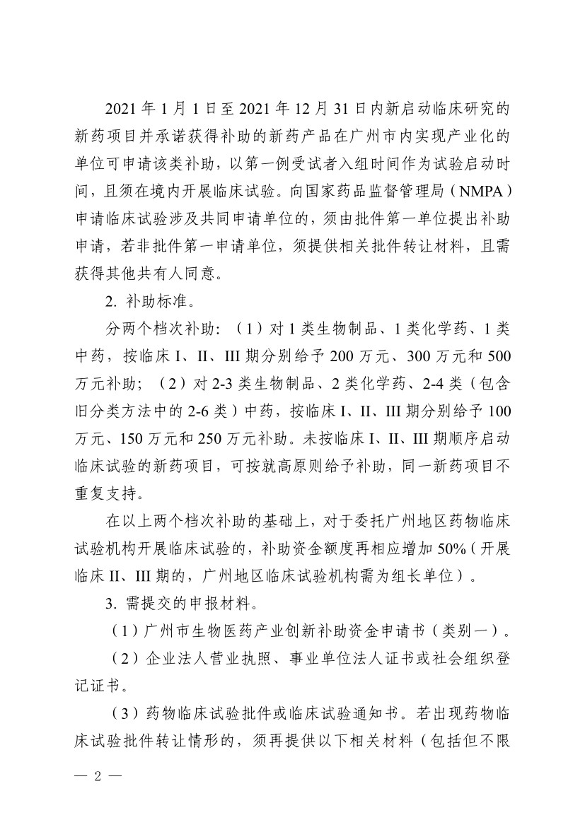 補助范圍:2021 年 1 月 1 日至 2021 年12 月31 日內新啟動臨床研究的新藥項目并承諾獲得補助的新藥產品在廣州市內實現(xiàn)產業(yè)化的單位可申請該類補助,以第一例受試者入組時間作為試驗啟動時間,且須在境內開展臨床試驗。