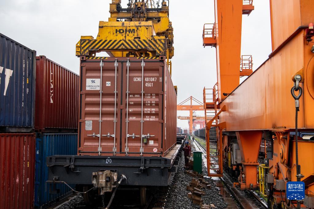 2月19日,作業(yè)車(chē)輛在重慶果園港牽引中歐班列進(jìn)行裝載作業(yè)。新華社記者 唐奕 攝