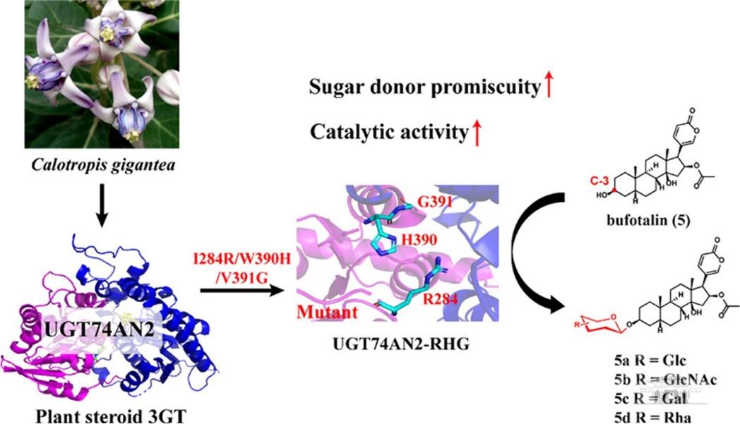 強(qiáng)心甾類化合物(Cardiotonic steroids,CTSs)是一類歷史悠久的能夠有效治療心力衰竭的重要天然產(chǎn)物。CTSs還具有多種藥理活性,如神經(jīng)炎癥、抗腫瘤、免疫調(diào)節(jié)和抗病毒等。強(qiáng)心甾類化合物C-3位的糖基化,可以顯著增強(qiáng)其溶解度、降低毒性并提高其生物活性,對(duì)強(qiáng)心甾藥物的臨床開發(fā)和應(yīng)用具有重要意義。此外,C-3位糖基的種類也被證實(shí)與其藥理活性密切相關(guān)。植物強(qiáng)心甾類糖基轉(zhuǎn)移酶(Sb3GTs)是一種高效、綠色、立體/區(qū)域選擇性強(qiáng)的生物催化工具。然而已被鑒定的幾個(gè)Sb3GTs均存在糖基化區(qū)域選擇性弱,糖供體寬泛性差等缺點(diǎn),其對(duì)強(qiáng)心甾的識(shí)別和催化作用機(jī)理也尚不清楚。