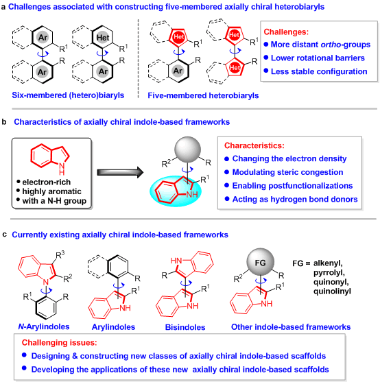 軸手性二芳基骨架是一類重要的手性結(jié)構(gòu)單元,不僅廣泛存在于天然產(chǎn)物、藥物活性分子以及功能材料中,而且被應(yīng)用于手性配體和手性催化劑中。所以,催化不對稱構(gòu)建軸手性骨架引起了化學工作者們的強烈關(guān)注。目前,該領(lǐng)域發(fā)展尤為迅速的是軸手性六元(雜)芳基骨架的構(gòu)建,例如:軸手性聯(lián)萘、聯(lián)苯和1-芳基異喹啉骨架。與之相比,軸手性五元雜芳基骨架的催化不對稱構(gòu)建卻發(fā)展緩慢,主要是由于此類骨架存在鄰位基團距離較遠、旋轉(zhuǎn)能壘較低、構(gòu)型穩(wěn)定性較差等挑戰(zhàn)性問題(圖1a)。因此,催化不對稱構(gòu)建軸手性五元雜芳基骨架的探索依然是任重而道遠。
