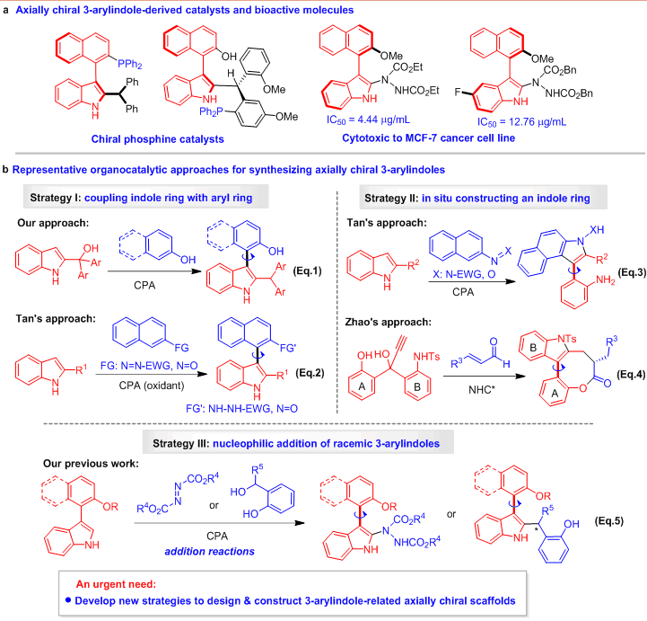 在目前已構(gòu)建的軸手性吲哚骨架中,3-芳基吲哚骨架由于在手性膦催化劑和生物活性分子中的應(yīng)用(圖2a),該類骨架的構(gòu)建具有重要意義,而不對稱有機催化被認為是構(gòu)建軸手性骨架的一種強有力方法。目前,不對稱有機催化下構(gòu)建軸手性3-芳基吲哚骨架的代表性策略主要有三種(圖2b)。第一種策略是手性磷酸(CPA)催化下吲哚環(huán)與芳環(huán)的直接偶聯(lián)策略,主要包括石楓課題組發(fā)展的2-吲哚甲醇與2-萘酚的偶聯(lián)反應(yīng)(Eq. 1, Angew. Chem. Int. Ed. 2017, 56, 116)、南方科技大學譚斌課題組發(fā)展的2-取代吲哚與偶氮萘或亞硝基萘的偶聯(lián)反應(yīng)(Eq. 2, Nat. Chem. 2018, 10, 58; Chem 2020, 6, 2046);第二種策略是有機催化下原位構(gòu)建吲哚環(huán)的策略,主要包括譚斌課題組發(fā)展的CPA催化下2-取代吲哚與偶氮萘或亞硝基萘的重排反應(yīng)(Eq. 3, Nat. Chem. 2018, 10, 58; Chem 2020, 6, 2046)、新加坡國立大學趙宇課題組發(fā)展的手性氮雜卡賓(NHC*)催化下炔丙醇與烯醛的串聯(lián)反應(yīng)(Eq. 4, J. Am. Chem. Soc. 2019, 141, 17062);第三種策略是CPA催化下外消旋3-芳基吲哚的親核加成反應(yīng),主要是石楓課題組發(fā)展的3-芳基吲哚平臺分子與偶氮二羧酸酯或鄰羥基芐醇的加成反應(yīng)(Eq. 5, Angew. Chem. Int. Ed. 2019, 58, 15104)。盡管有了這些報道,催化不對稱構(gòu)建該類骨架的策略仍然非常有限。所以,迫切需要發(fā)展新策略,以實現(xiàn)基于3-芳基吲哚的軸手性骨架的設(shè)計與構(gòu)建。