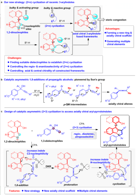 為了實現(xiàn)上述目標,石楓課題組基于對手性吲哚化學的理解(For a summary: Acc. Chem. Res. 2020, 53, 425),提出了基于3-芳基吲哚平臺分子參與的催化不對稱(2 + n)環(huán)化反應(yīng)的策略,用于構(gòu)建新型的軸手性3-芳基吲哚稠環(huán)骨架。在該策略中,吲哚的C2-位和NH基團作為親核位點,使3-芳基吲哚平臺分子作為1,2-雙親核試劑,在手性布朗斯特酸(B*-H)催化下與合適的雙親電試劑(E1-E2)發(fā)生(2 + n)環(huán)化反應(yīng)(圖3a)。由于新形成的環(huán)系與OH基團之間的空間位阻,可以實現(xiàn)新型軸手性3-芳基吲哚稠環(huán)骨架的構(gòu)建。該策略的獨特優(yōu)勢是:能夠形成新的環(huán)系、構(gòu)建新型的軸手性骨架、產(chǎn)生多重手性元素。然而,采用該策略仍然需要克服一些挑戰(zhàn),主要包括:(1)尋找到合適的能夠被B*-H活化的雙親電試劑,以實現(xiàn)其與3-芳基吲哚的(2 + n)環(huán)化反應(yīng);(2)由于兩種反應(yīng)底物中均存在兩個競爭的反應(yīng)位點,所以需要控制好(2 + n)環(huán)化反應(yīng)的區(qū)域選擇性和對映選擇性;(3)當采用外消旋的雙親電試劑參與(2 + n)環(huán)化反應(yīng)時,需要同時控制好所構(gòu)建骨架的軸手性和中心手性。